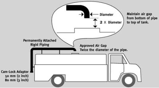 AAG; The air gap between the end of the pipe and the tank must be at least 2 times the diameter of the pipe (See the diagram below). Rigid piping must also be permanently attached to the vehicle and fitted with a Cam-Lock adaptor (coupler end).