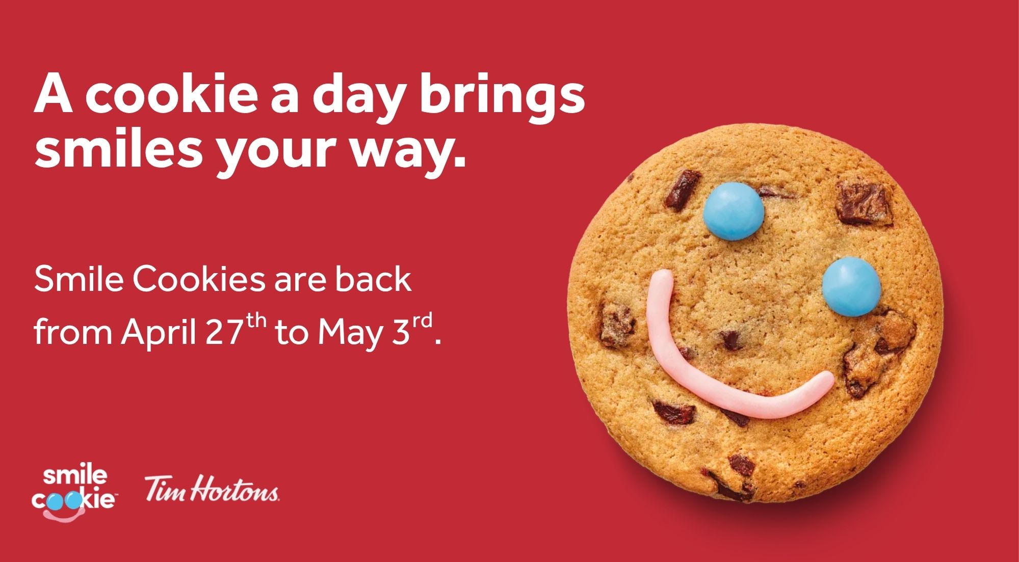 Smile Cookies are back from April 27 to May 3. Stop by your local Tim Hortons and grab one!